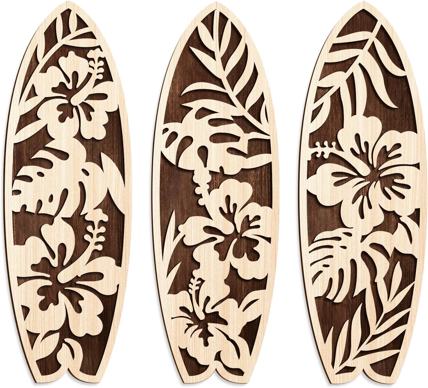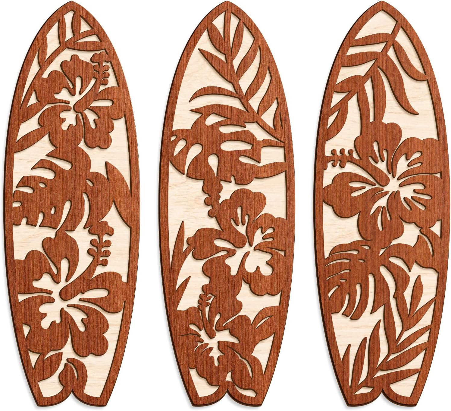 3 Pieces Hibiscus Surfboard Decor for Bedroom Wooden Beach Wall Decor Summer Wood Surfboard Wall Hanging Sign for Tropical Living Room Decoration, 4”Lx12W”*3 (Brown)