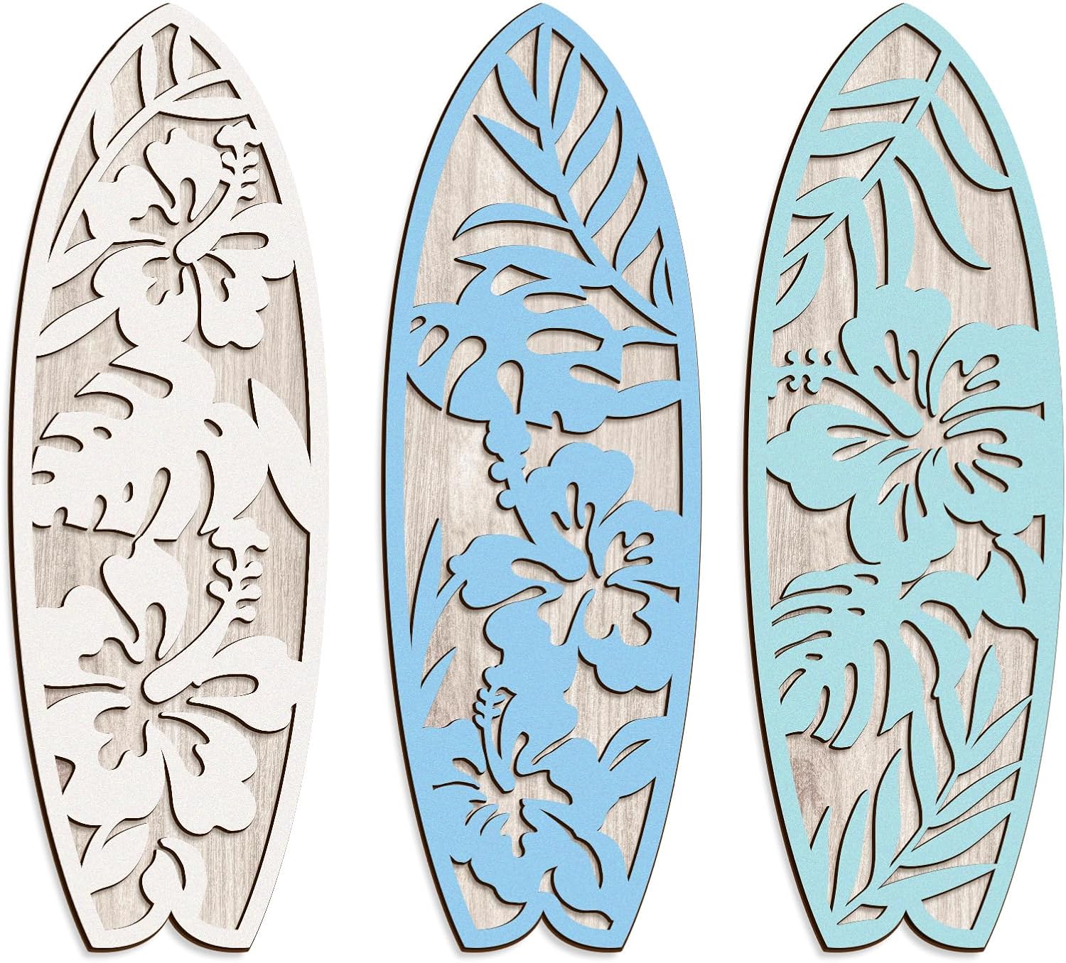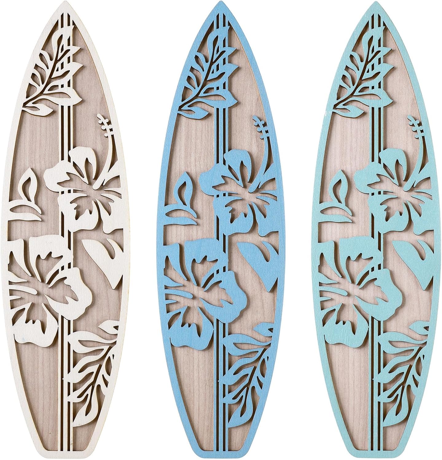 3 Pieces Surfboard Decor for Bedroom Wooden Beach Wall Decor Summer Wood Surfboard Wall Hanging Sign for Tropical Living Room Decoration(Hibiscus,Blue)