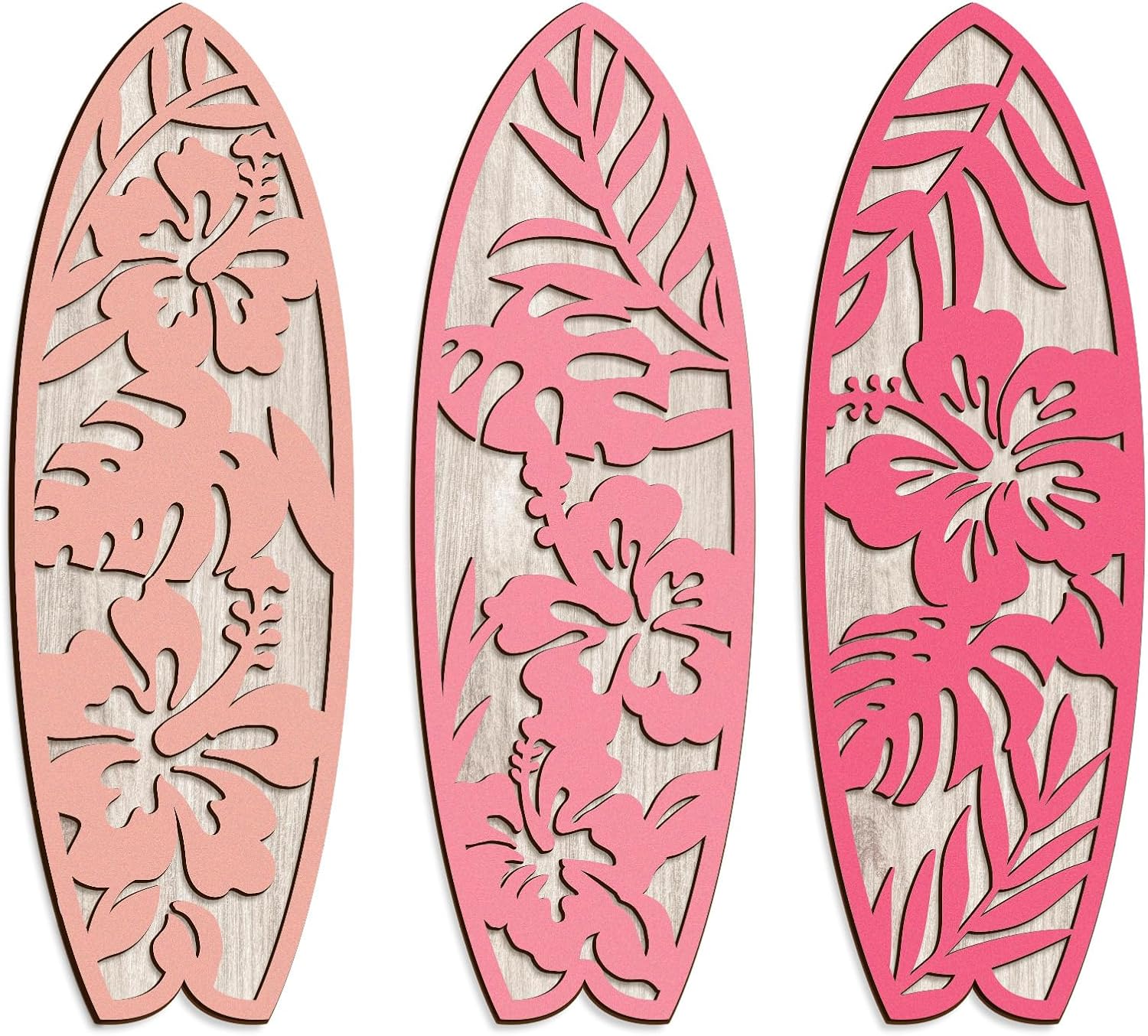 3 Pieces Hibiscus Surfboard Decor for Bedroom Wooden Beach Wall Decor Summer Wood Surfboard Wall Hanging Sign for Tropical Living Room Decoration, 4”Lx12W”*3 (Pink)