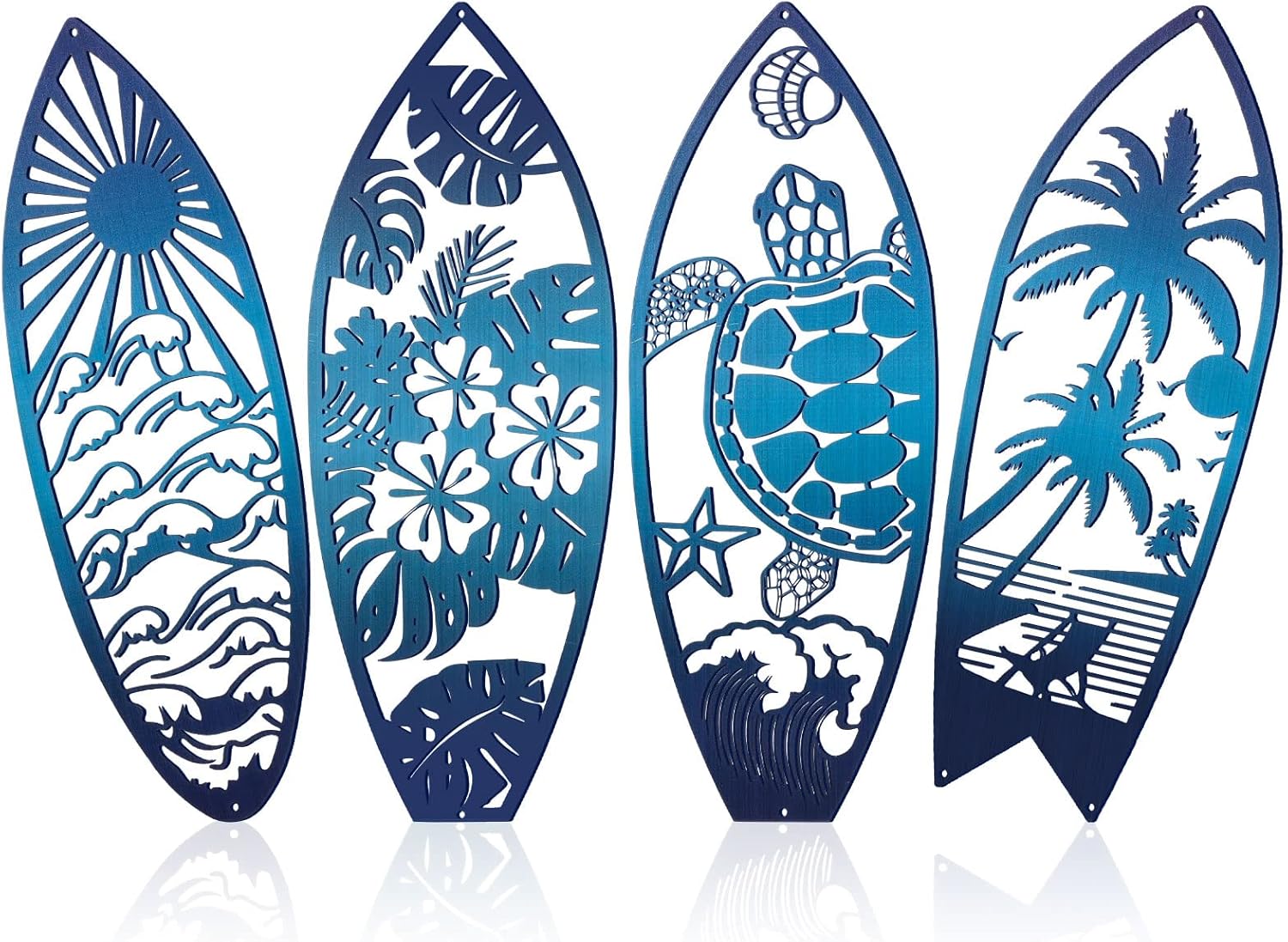 4 Pcs Metal Surf Board Wall Decor Summer Tropical Metal Surfboard Beach Signs Tropical Palm Tree Art Turtle Decoration Summer Wall Decor for Door(Blue)